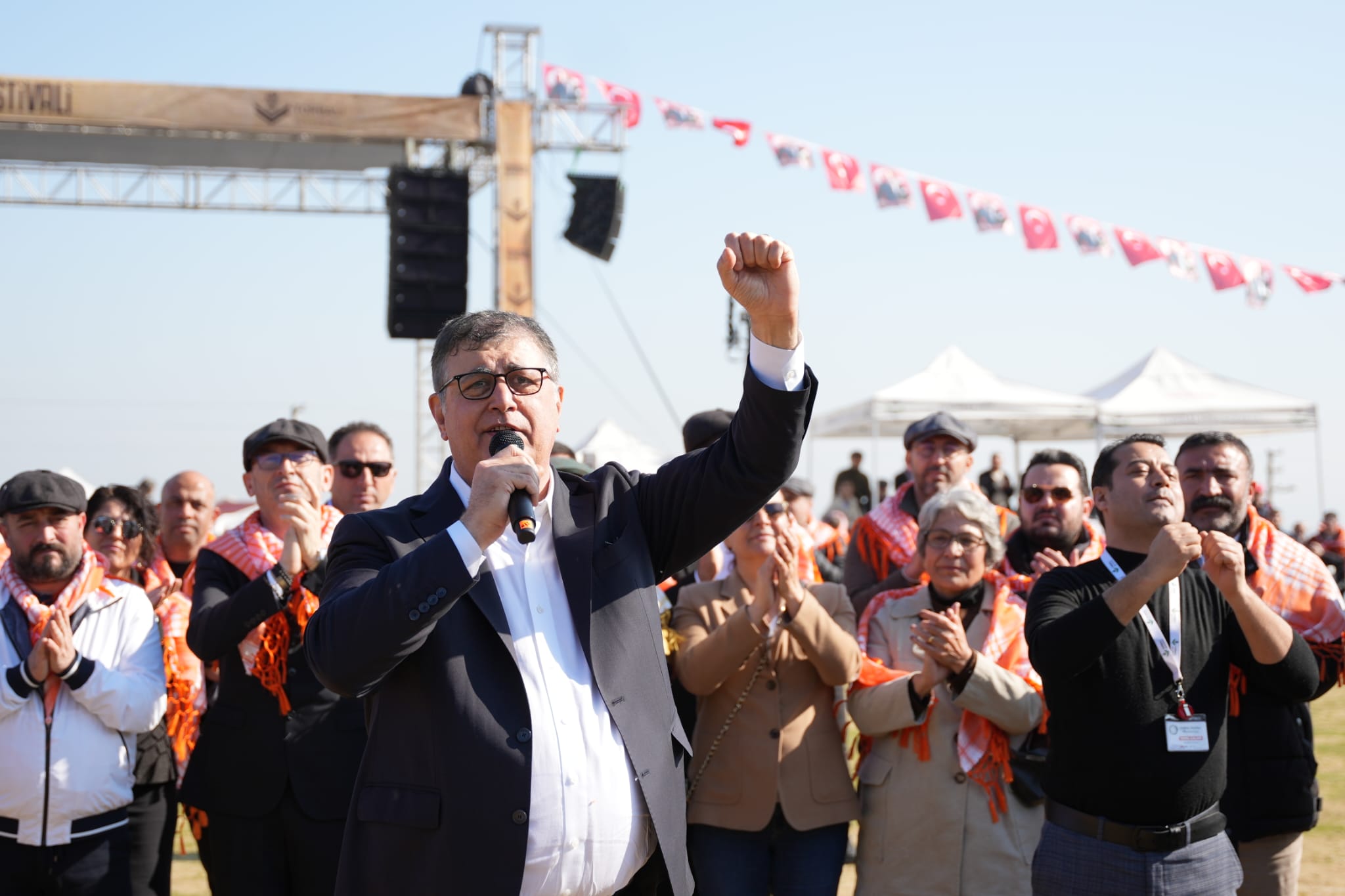 Festivalimizde konuşan ve burada olmaktan dolayı mutluluk duyduğunu ifade eden İzmir Büyükşehir Belediye Başkanı Cemil Tugay, "Daha önce aday olarak güreşe gelmiştim. Bu dönem boyunca, deve güreşlerinin olduğu her yere vatandaşlarımıza merhaba demek için gittim. Halkımızın, milletimizin gelenek ve göreneği neredeyse biz de onların yanında olacağız. Olmaya da devam edeceğiz. İzmir’de milletimizin yaşatmaya çalıştığı bütün gelenek ve göreneklerin yanında olacağız" diye konuştu. Tugay, Hamsi Şenliği’nde yaşanan bir diyaloğu da hatırlatarak "Bir hanımefendi yaklaşıp bana ’Ordudan atılan teğmenleri belediyede işe alacakmışsın, doğru mu?’ dedi. ’Evet’ dedim. Bana ’Alnından öpebilir miyim?’ dedi. Bu gurur bizim. Bu gurur Türk milletinin. Yaşasın Türkiye, yaşasın İzmir. Hepimiz Mustafa Kemal’in askerleriyiz" diye konuştu.